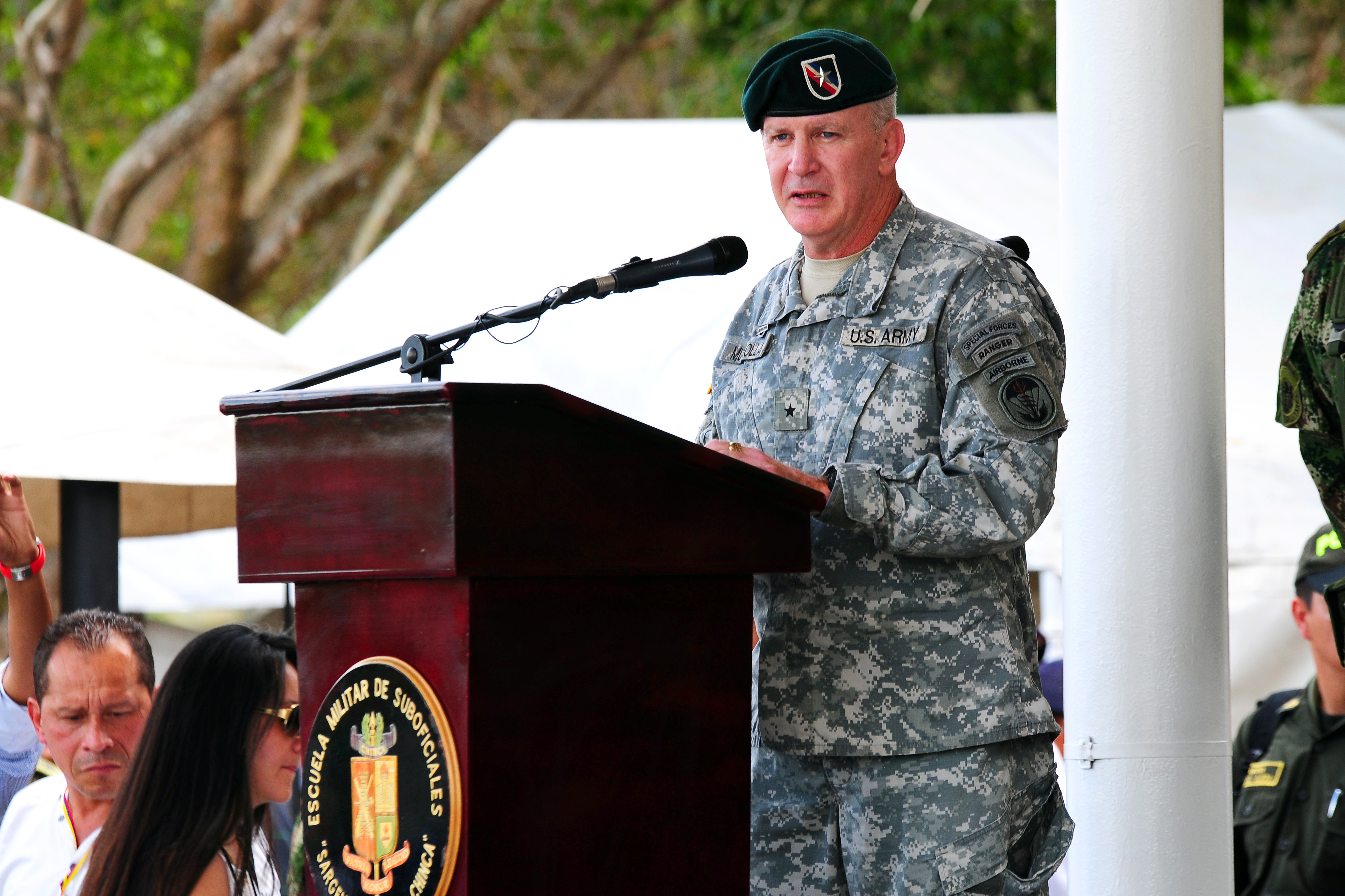 U.S. Army Brig. Gen. Sean P. Mulholland, the commander for Special Operations Command South, gives his opening remarks during the opening ceremony for the Fuerzas Comando competition at Fort Tolemaida, Colombia, July 23. Fuerzas Comando, established in 2004, is an U.S. Southern Command-sponsored special operation skills competition and fellowship program. This event is aimed at enhancing training and strengthening regional and multinational cooperation, mutual trust, readiness, and interoperability of special operations forces in the region.